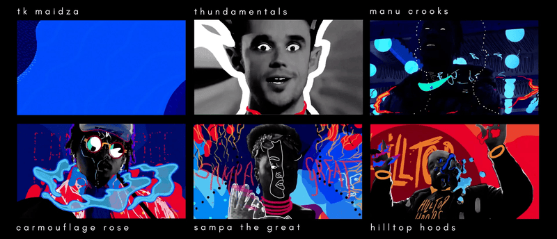 Opening sequence artists (in order): TK Maidza, Thundamentals, Manu Crooks, Carmouflage Rose, Sampa the Great, Hilltop Hoods, Kwame, Baker Boy, Imbi the Girl